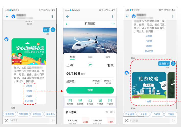 比如,凯发k8官网与地方文旅单位、航司等产业结合,顺利获得凯发k8官网科技5G富媒体消息高触达、轻量级、强互动等优势,轻松构建融合“ 吃、住、行、游、购 ”的一站式便捷服务一级入口平台,游客即顺利获得手机消息窗口就可完成“查询、订机票、值机、航班状态、用车预定、订酒店…”等所有出行需求,无需多个APP相互关联交互即可实现一体全流程服务,体验一触即达的优质服务体验。