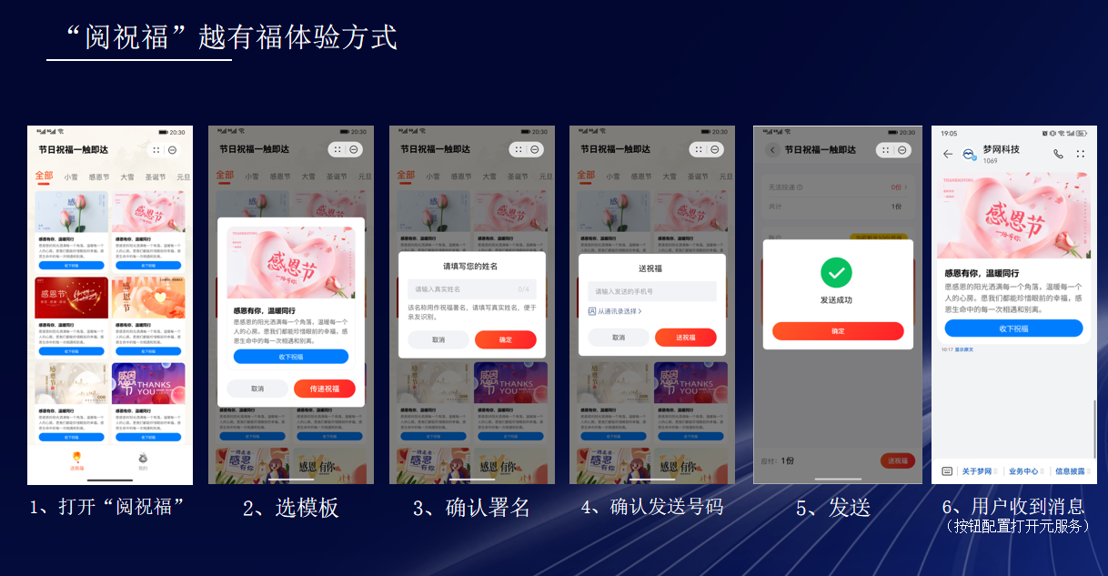 在本次大会上,凯发k8官网科技还发布了结合节日祝福应用场景的“阅祝福”元服务,其基于手机通讯录,是为鸿蒙用户打造的富媒体祝福信息发送工具,拥有超过100种的精美模板,极大地丰富了社交互动体验。